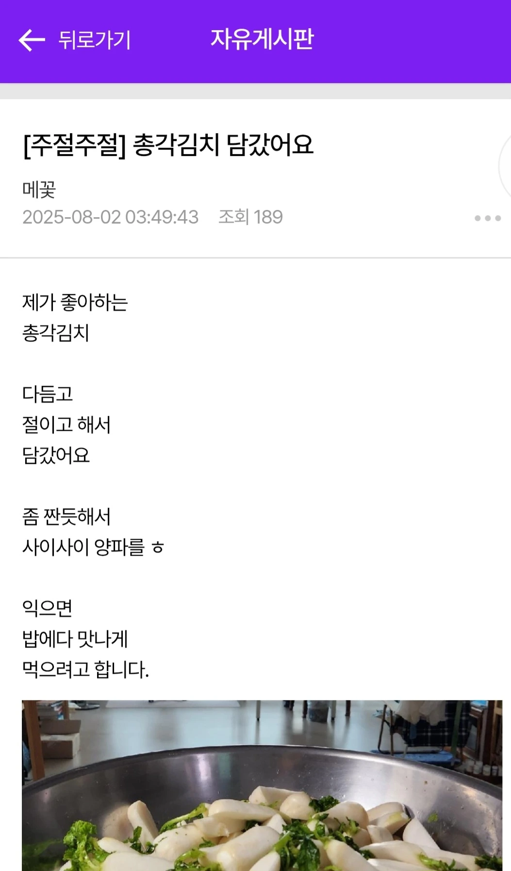총각김치에 대한 스토리를 알고 있는 남편은 김치를 담글 때면 고춧가루를 넉넉히 넣는다. 그렇게 추억을 더듬어가며 총각김치를 완성했다. 감치를 담그고 나니 누군가에게 총각김치 담근 일을 말하고 싶어졌다. 아침마다 출석체크하는 지역 마트앱이 생각났다. 이 앱에는 일상 이야기를 올리면 점수를 주는 코너가 있다. 나는 빠지지 않고 꽃사진과 간단한 글을 올리고 있는데 나름 댓글을 많이 받는다. 이번에는 총각김치 담근 이야기를 올렸다.