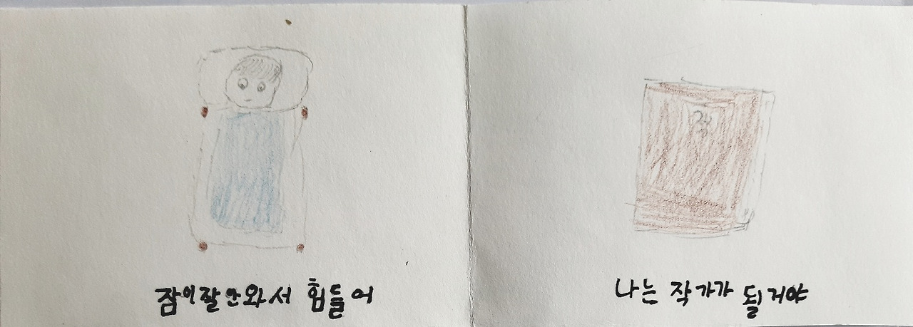 이 어린이는 소심하고 말이 없으며 사교성도 부족한 어린이다. 너무 수줍어서 말을 하면 거의 들리지 않았다. 다행히 글 쓰는 걸 좋아하고 표현력도 좋다. 이 어린이가 잠이 안 와서 힘들어한다는 걸 그림책 만들기를 하면서 알았다. 예민하고 생각이 많아서 그런 거 같다. 마지막 문장이 마음에 든다.
