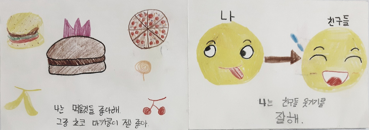 나를 주제로 문장을 쓰고 그림을 그리면서 어린이들을 나름 자신에 대해 생각한다. 좋아하는 것도 힘든 것도 많을 텐데 한 가지만 고르게 되어 있으니 선택을 위한 고민이 당연 있을 수밖에 없다. 바로 떠오르는 걸 쓴 어린이도 있고 고민 끝에 한 가지를 겨우 고른 어린이도 있을 것이다. 고민과 선택 모두 자신의 성격이며 특징인 것이다.