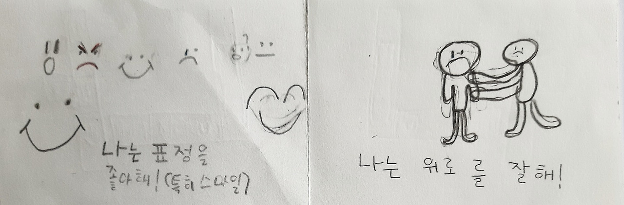 이 어린이는 가만히 있는 걸 잘한다고 했다. 집중력도 좋고 모든 활동을 잘하는 어린이다. 그런데 그림을 보면 그냥 서 있는 걸 표현했다. 이건 무슨 능력일까, 궁금해진다. 뭘 잘 참는다는 뜻인 거 하기도 하다. 물어봤을 때는 그냥 웃기만 했다.