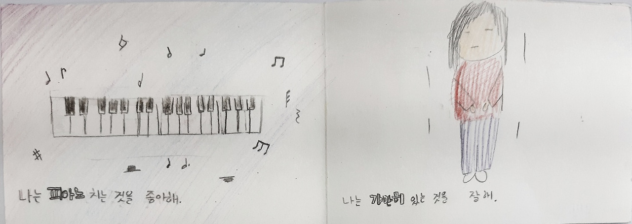 이렇게 문장을 쓰고 난 뒤 만든 책자에 표현을 한다. 문장에 그림이 들어가면 분위기가 확 달라진다.