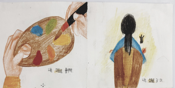 이 어린이는 조용한 편이다. 그림을 잘 그리고 표현력이 좋다. 네 쪽 그림책 만들면서 새로운 면을 보았다. 해보고 싶은 게 많은, 꿈틀거리는 열정으로 가득한 어린이였다.