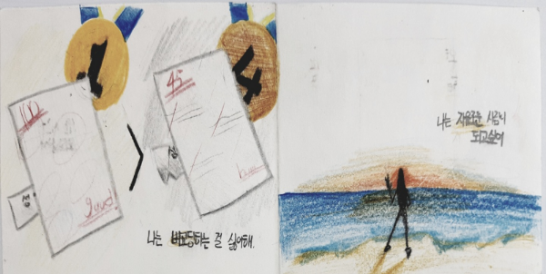 <그림 1>을 그린 어린이다. 차분하고 좀처럼 흥분한 모습을 드러내지 않는다. 그 어린이가 비교당하는 게 싫다고 했고 이어 자유로운 사람이 되고 싶다고 썼다. 부모님의 기대 때문에 압박을 느끼는 듯도 했다. 마지막 장면에서 어린이의 고민과 바람이 느껴진다. 겨우 네 개의 문장이지만 그림과 함께 놓고 보니 이전에 보지 못한 한 어린이의 내면이 보이는 듯하다. 그림책의 매력인 듯하다.