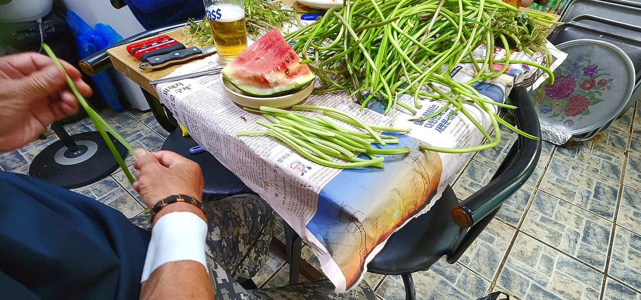 좀 있으니 주인내외랑 친한 분이 오셨다. 우리하고도 잘 알아서 정답게 인사를 받아준다. 오자마자 고구마순 까는 걸 돕는다. 늘 바지런하고 분별있는 분이다. 남편은 이분들이 주고받는 얘기를 즐긴다. 무슨 관객이 되어 연극 한 편을 보는 기분이라고 한다.