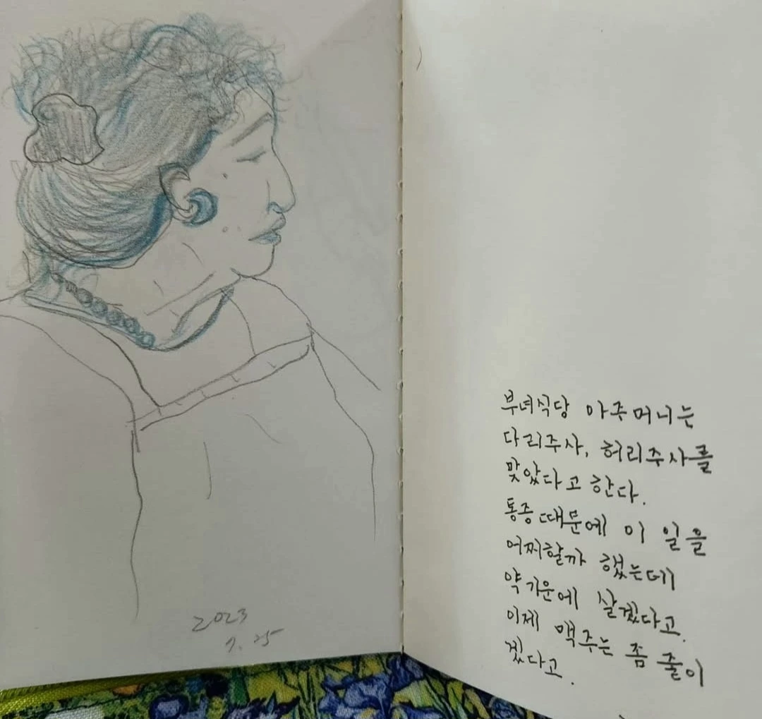 그곳에 드나들면서 아주머니를 그린 적이 있다. 그림을 그려 보니 서양 배우처럼 선이 굵고 우아하다. 아주머니는 음식점을 하면서도 멋내는 걸 잊지 않는다. 늘 목걸이와 귀걸이 반지를 하고 있다. 머리 위쪽은 탈모로 머리카락이 꽤 빠져있지만 틀어 올린 머리와 목걸이로 인해 매력 있게 보인다. 아주머니는 속이야기를 잘 털어놓는다. 이십여 년 드나들다 보니 아주머니가 처녀 시절 어디서 살았고 결혼해서 어찌 살았는지 훤히 알고 있다.