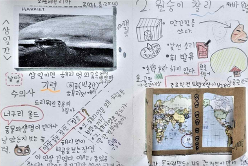 어린이들은 자부심에 찬 눈빛으로 결의를 다지는 듯했다. 우리는 먼저 앞으로 읽으면서 정리할 <해리엇> 독서록을 만들었다. 도화지를 아코디언 북처럼 만들어 쓸 예정이다. 이번에는 다른 해보다 더 멋지고 아름다운 독서록을 만들면 좋겠다고 생각했다. 그냥 독서록이 아닌 예술 독서록이다. 나는 때때로 미리 정성 들여 쓴 독서록을 어린이들에게 보여줄 것이다.