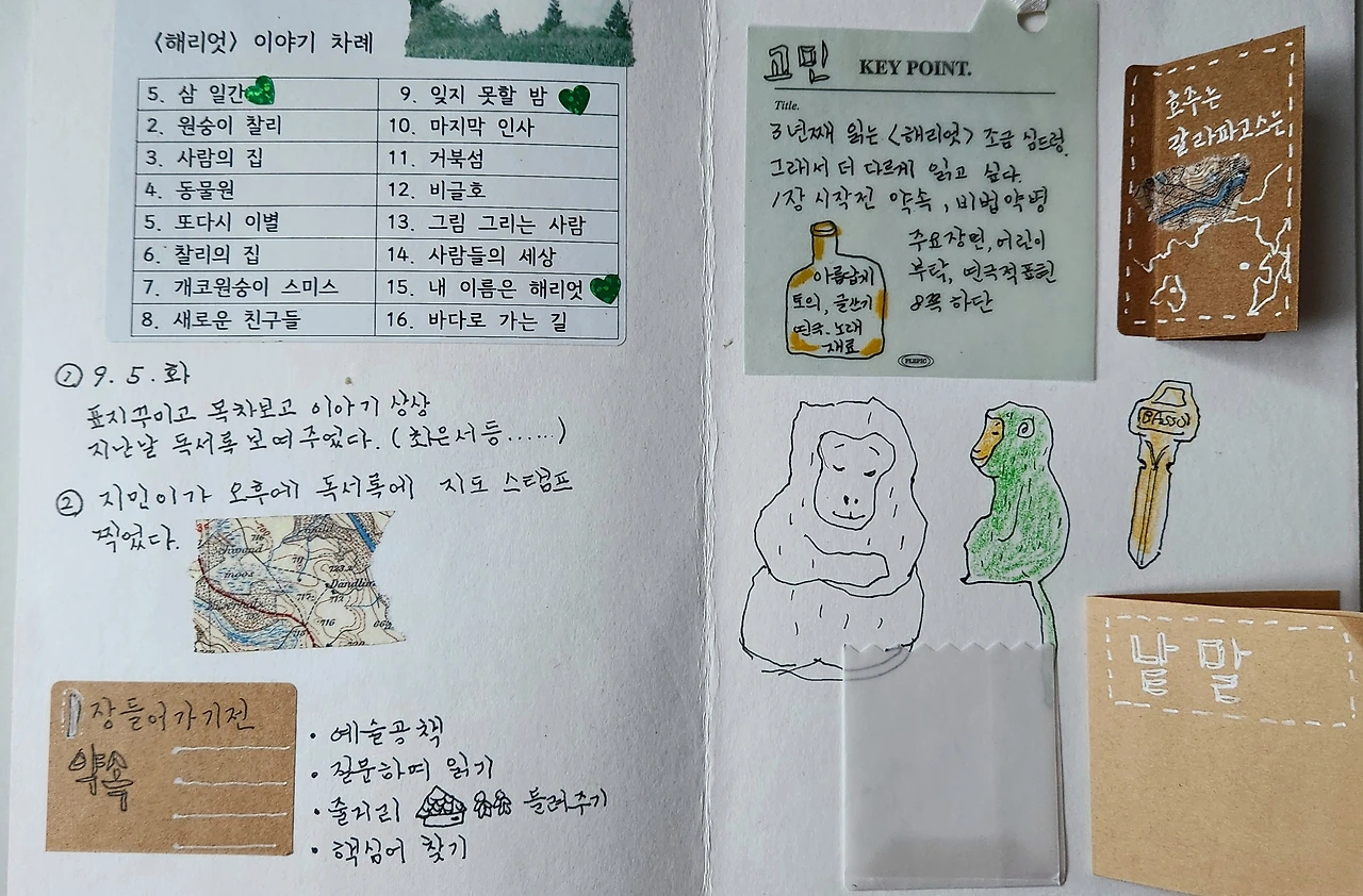 첫 장을 읽으며 간간이, 다 읽은 뒤에도 어린이들은 독서록을 썼다. 이야기에는 원숭이 찰리, 수의사, 늙은 거북 해리엇이 등장한다. 찰리는 수의사가 가지고 있어야 할 열쇠를 쥐고 있다. 어떻게 얻은 것일까, 궁금증이 일어난다.