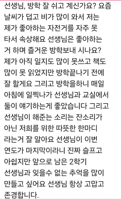 선생님은 어떻게 지내시나요? 선생님, 괜찮으시죠? 선생님이 그립네요. 이제 개학도 얼마 안 남은 것 같아요! 이제 5학년 2학기를 새로운 마음으로 시작해야겠네요. 근데 좀 오랜만에 만나는 거라 선생님, 친구들이랑 좀 어색할 수도 있겠네요. 일단은! 선생님이랑 건강한 모습으로 만나면 좋겠네요!