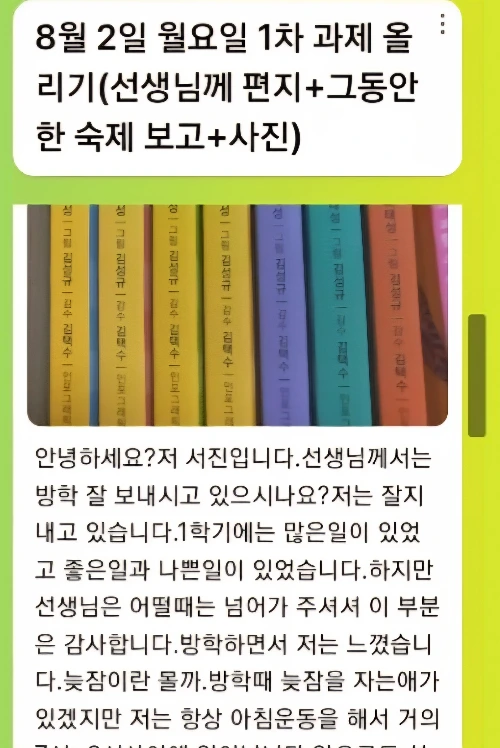 방학에 들어가기 전 한 가지 약속을 더 했다. 방학 중 한 번은 선생님에게 자신이 어떻게 지내는지 사진과 간단한 글로 보고하는 과제다. 또 하나는 선생님에게 편지 쓰기 과제다. 분량은 짧아도 좋으니 어떻게 지내는지 중간중간 꼭 알려달라고 했다.