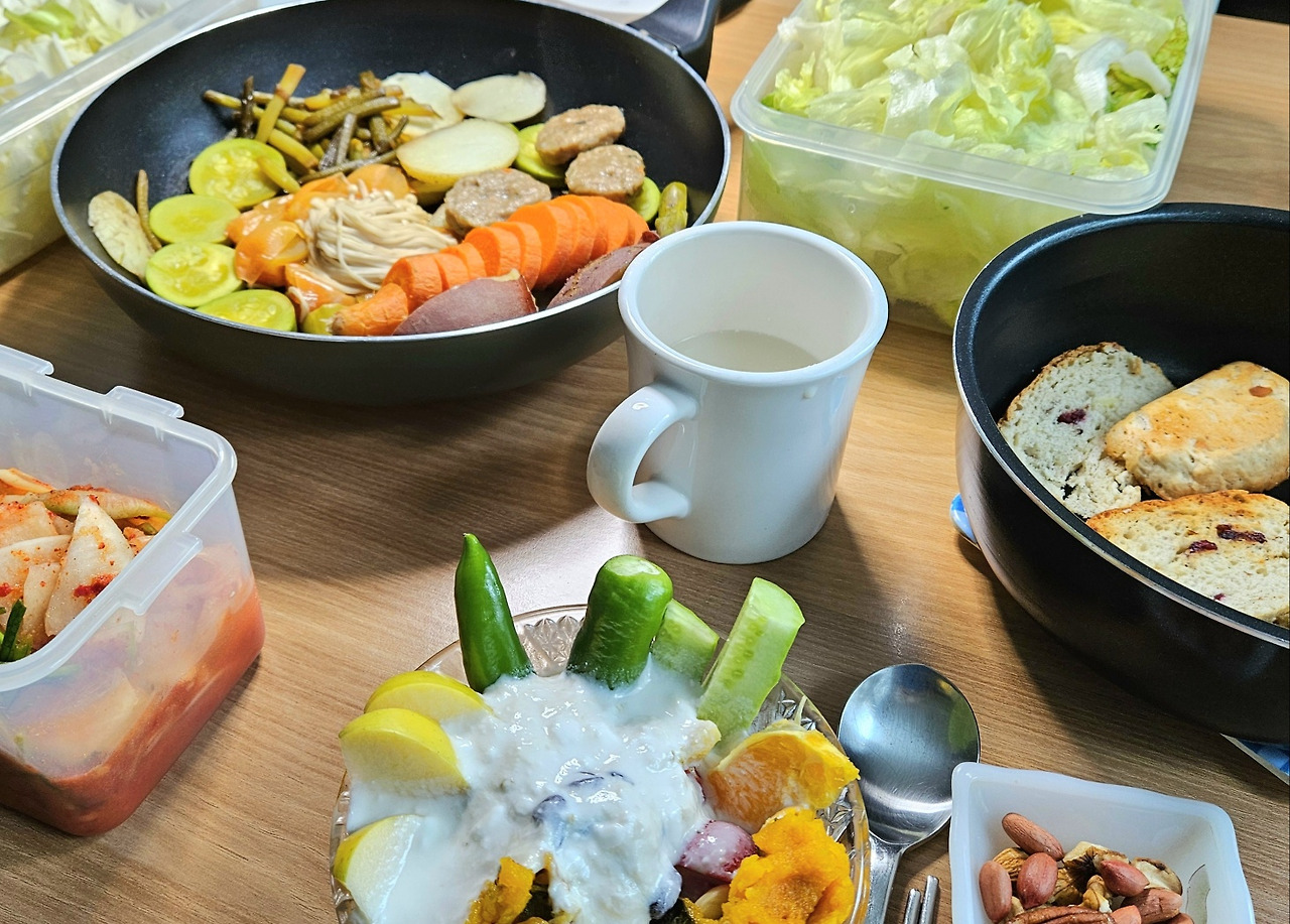 상차림이 다 되었다. 남편과 창가에 붙여놓은 식탁에 가서 앉는다. 9시, 교실은 지금 막 1교시를 시작하는 시간이다. 그 1교시에 식사를 한다. 천천히 오래오래 음식을 씹으면서 창밖도 보고 영상도 본다. 가끔 메모도 한다.