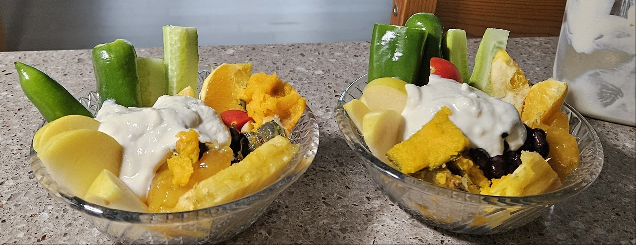 프라이팬에 올린 것들이 덥혀지거나 익는 동안 과일 샐러드를 준비한다. 색색의 채소와 과일을 보면서 만지는 이 시간이 새삼스레 좋다. 투명한 유리그릇 두 개에 오이, 방울토마토와 연둣빛 사과, 단호박, 주황색 한라봉을 넣는다. 과일이나 채소는 그때마다 있는 대로 조금씩 넣은 뒤 삶은 콩을 넣고 집에서 만든 요플레를 끼얹어 마무리한다.