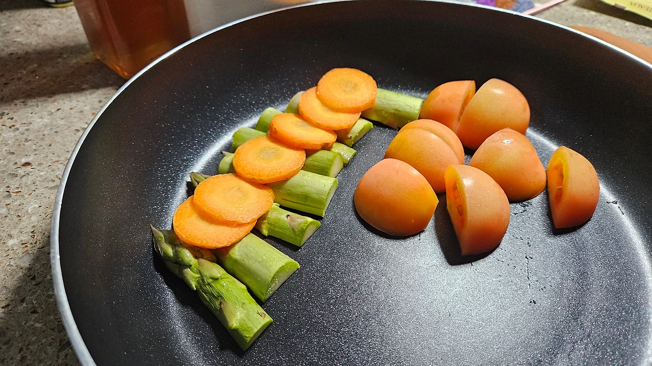 음식은 건강을 생각해서 간이나 기름을 적게 써서 조리한다. 토마토, 대파, 아스파라거스, 버섯, 가지, 감자, 양파는 날 거 그대로 썰어서 프라이팬에 올린 뒤 약불로 익힌다. 미리 쪄 놓은 고구마도 따뜻해지라고 한 쪽에 놓는다. 소시지나 동그랑땡 같은 인스턴트식품을 쓸 때에는 미리 푹 삶아 첨가물이나 기름기를 뺀 뒤 프라이팬에 올린다. 식사 전에 먹을 상추나 양배추도 잘 씻어 둔다.
