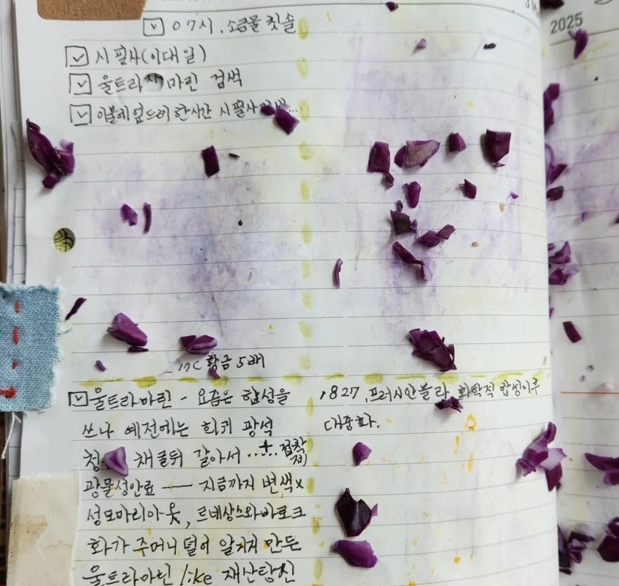 나는 영상을 보기도 하고 옆 테이블에 펼쳐 놓은 일지에 어제 깜빡 쓰지 못한 일을 쓰거나 아침에 있었던 일을 몇 가지 적는다. 블루베리를 씻으면서 나온 보랏빛 물로 노트를 물들이기도 한다. 찢어진 깻잎 쪼가리로 즙을 내 공책 바탕에 문지르기도 한다. 딴 척이 심해질 듯하면 남편은 얼른 식사하라고 눈짓을 한다.