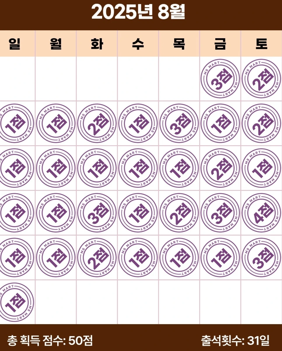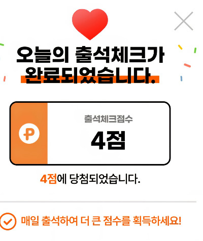 클릭하면서 주어진 미션을 수행할 때마다 포인트가 1원씩 쌓인다. 특히 출석 체크 코너는 점수판이 돌아가다 멈추는데 1점부터 4점까지 받을 수 있다. 주로 1,2점을 받는데 어쩌다 3점이 나오면 몹시 기쁘다. 한 달에 한번은 최고 점인 4점을 맞추기도 한다. 이런 날은 로또를 맞은 양 기분이 올라간다.