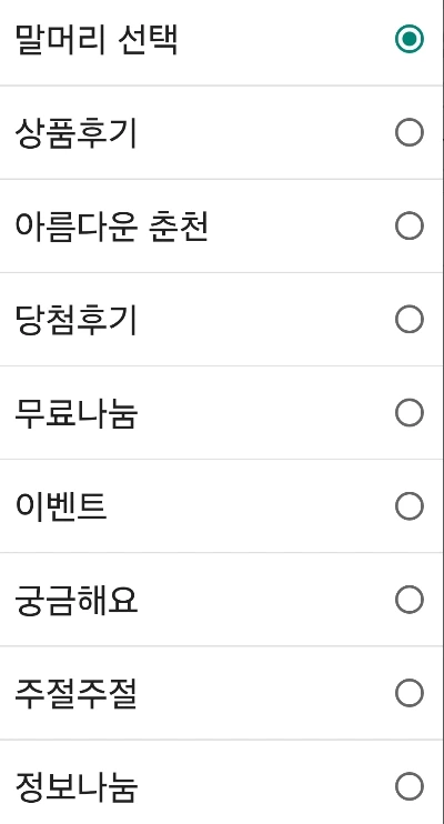 놀이터에는 하트 모양의 '좋아요' 버튼이 없다. 글을 쓰고 등록 버튼을 눌러야 한다. 처음 마트 '놀이터'에 들어갔을 때에는 거의 '출첵(출석체크)했어요'라든가 '오늘도 1점이네요', '오늘도 하루 시작합니다!' 같은 글이 올라오곤 했다. 무슨 말을 쓸까, 뭘 올릴까 생각하면서 '말머리 선택' 탭을 눌러보았다. 글을 쓸 수 있는 다양한 메뉴들이 소개되어 있었다.