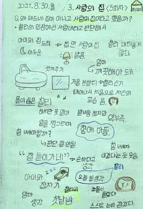 우리는 3장에서 찰리의 감정을 동그라미를 그린 뒤 색을 칠해 표현해 보았다. 검정을 칠한 어린이는 찰리의 머리가 복잡할 거라고 썼다. 파랑을 칠한 어린이는 찰리가 무서워하는 마음을 표현했다고 했다. 찰리를 위로하는 선물을 그려보기도 했다. 스마트폰을 그려 주고 싶다고 한 어린이는 찰리가 찰리 엄마와 서로 연락을 했으면 좋겠다고 했다. 찰리 엄마는 이야기가 끝나도록 등장하지 않았다. 어린이들 중 몇은 이야기가 끝날 때까지 찰리 엄마가 어디에 있는지 알고 싶어 했다.