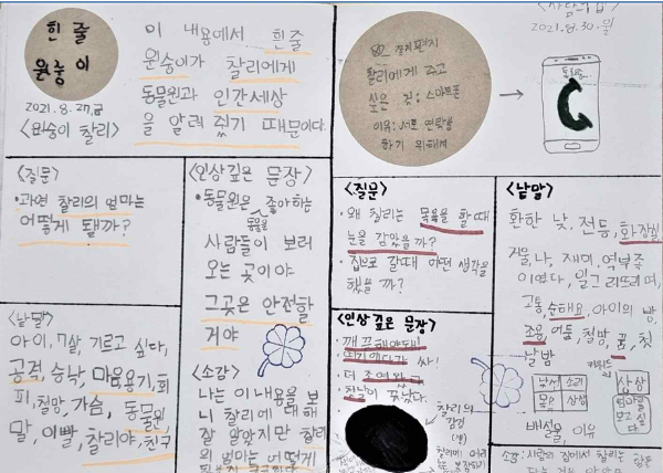 책을 읽기 전이었다면 놀이공원에 가서 동물을 보며 이런 생각을 하지 못했을 것이다. 책을 읽으면서 이 문제에 대해 선생님과 친구와 토의하고 자신의 생각을 독서록에 쓰면서 생각이 더 깊어진 것이다. 이제 동물을 다른 시선으로 보게 된 것이다.