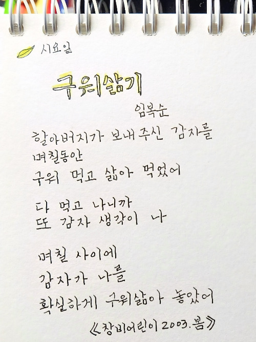 또 구워삶아야 할 이들이 있다. 시요일 지인들이다. 시요일에 필사한 시를 선물해서 그들의 마음을 구워삶고 싶다. 다행히 벌써 구워삶아졌다고 고백하는 분들이 꽤 있다.