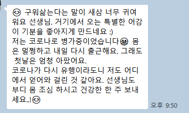 기분 좋은 문장이다. 이런 문장을 받기 위해 시를 고르고 필사를 하는지도 모르겠다. 시요일이 아니었으면 몰랐을 안부도 듣는다. 6학년을 담임하는 후배 선생님이 답장을 했다. 코로나로 고생했다는 소식을 듣고는 깜짝 놀랐다. 코로나에 걸린 뒤 6개월씩이나 어지럼증으로 크게 고생한 나로서는 코로나 말만 들어도 겁이 난다. 후배선생님이 빨리 기운을 찾아 다행이다.