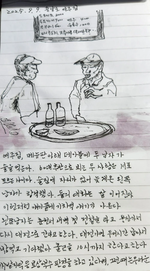 두 사람은 합이 잘 맞는지 한참 이야기를 나누었다. 그러다 왼쪽 남자가 먼저 일어섰다. 남자는 매일 춘천에서 새벽 첫 차를 타고 용산에서 기차를 갈아 탄 뒤 대전까지 간다고 했다. 오른편 남자는 아쉬운듯 자주 오라고 했다. 일어선 남자는 두어 달에 한번은 올 수 있다고 했다. 혼자 된 남자는 조금 더 있다가 일어섰다.