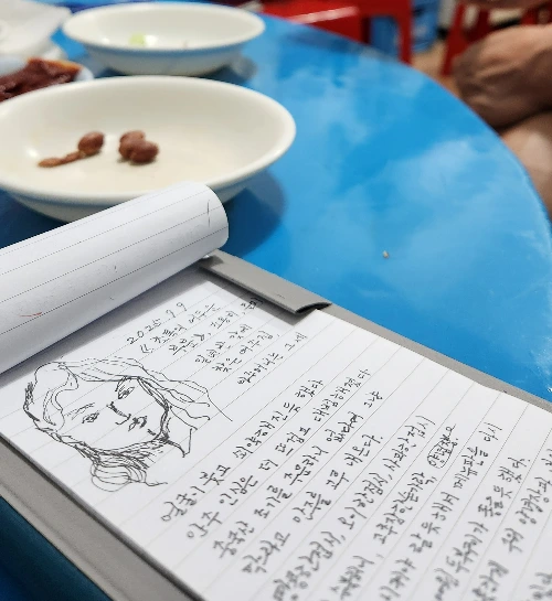 남편 대답에 노인은 뭔가 더 얘기를 하고 싶은 듯한 얼굴을 하다가 그만두고 일행과 잔을 주고 받았다. 메뉴판 아래 쪽 손님들이 제법 큰 목소리로 이야기를 나눈다. 이렇게 좁은 공간에서는 조금만 큰 소리로 말하면 절로 사연을 듣게 된다. 두 사람은 우리보다 먼저 온 사람들이다. 둘 다 혼자 온 사람들인데 테이블이 부족해서 합석한 듯 했다.