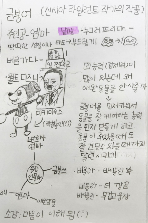 엠마가 금붕어를 어떻게든 살리려고 하는 모습을 보면서 나도 채송화가 죽기 전에 물도 주고 곰팡이 때문에 죽은 씨앗은 다시 씨를 심어야 하겠다는 생각이 들었다. 금붕어를 보면서 이모네가 키우는 개도 생각났다. 포메라니안 말고 큰 개가 있는데 그 강아지가 아주 늙은 개여서 금붕어 조슈아와 비슷한 것 같다.(이효정)