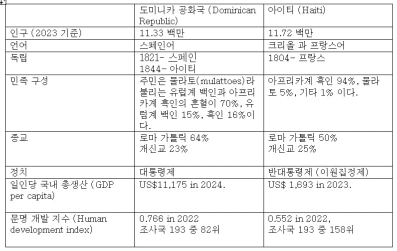 도미니카 공화국과 아이티는 카리브해, 히스페니올라(Hispaniola) 섬에 있는 두 나라이다. 1600년대 후반, 스페인이 지배하던 이 섬의 서쪽 지역을 프랑스가 점령해서 두 나라로 나누어졌다. 세계은행에 의하면, 아이티의 2024년 일인당 국내 총생산은 미화 1,693달러 로서, 도미니카 공화국의 것, 미화 10,717달러의 6분의 1에 불과하다. 2024년 도미니카의 연간 경제 성장률은 5.1% 였다. 라틴 아메리카 국가 중, 도미니카 경제가 가장 빠르게 성장하고 있다. 2023년, 아이티의 국내 총생산은 1.9% 감소했고, 지난 수년간 연속하여 마이너스 성장을 하고 있다. 아이티는 세계에서 가장 가난한 나라, 가장 불안정한 나라 중 하나이다.