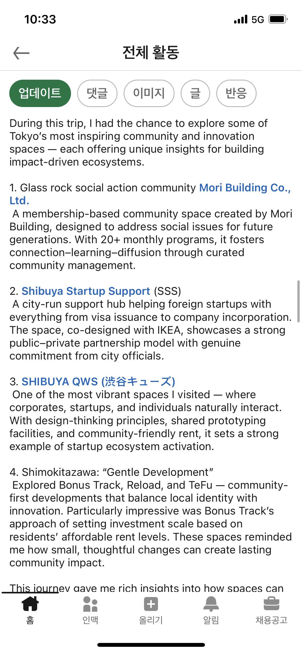 회사의 리더십에서 개인 커리어 방향에 있어 배려를 해주신 덕분에 이번에 도쿄에 임팩트 공간 리서치 겸 스터디 트립을 다녀왔다. 사실 도쿄에 가기 전에는 AVPN 애뉴얼콘퍼런스라는 큰 행사가 있었고, 좋은 기회를 주신 것이라는 건 알지만 마음 한편에서는 동시에 준비를 해야 하는 큰 부담이 되기도 했다. 또한 콘퍼런스 2주 전, 갑작스럽게 지난 거진 10년간 해외 사업만 하던 내게 정말 급했는지 국내 사업의 지역 대학생을 위한 프로그램 제안서 작업을 도와달라고 하여 진행하던 모든 프로젝트는 잠시 홀딩하고 1주일을 꼬박 그 일에 매달려야 했다. 이미 150%로 달리고 있는 상황에서 내가 어떻게 기여를 할 수 있을지 막막하고, 사실 국내 로컬 사업은 내역량도 부족하고, 내가 왜 해야 하는지 동의도 되지 않는 일을 일단 급하니 해야 했고, 아무리 임팩트 부동산 관련 하고 싶은 좋은 기회가 주어져도 그냥 다 버겁게 느껴질 수밖에 없었다. 그렇게 9월은 감사하면서도 버거운, 여러 감정이 뒤섞인 한 달이었다.