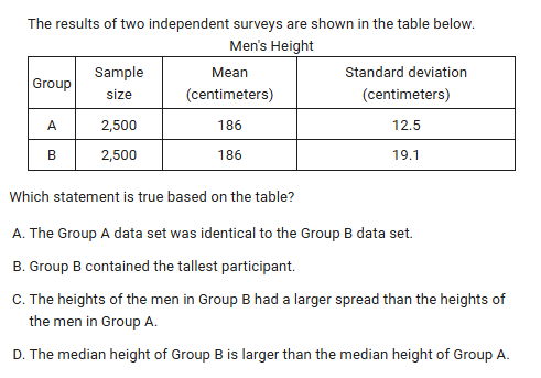 "The heights of the men in Group B had a larger spread than the heights of the men in Group A."