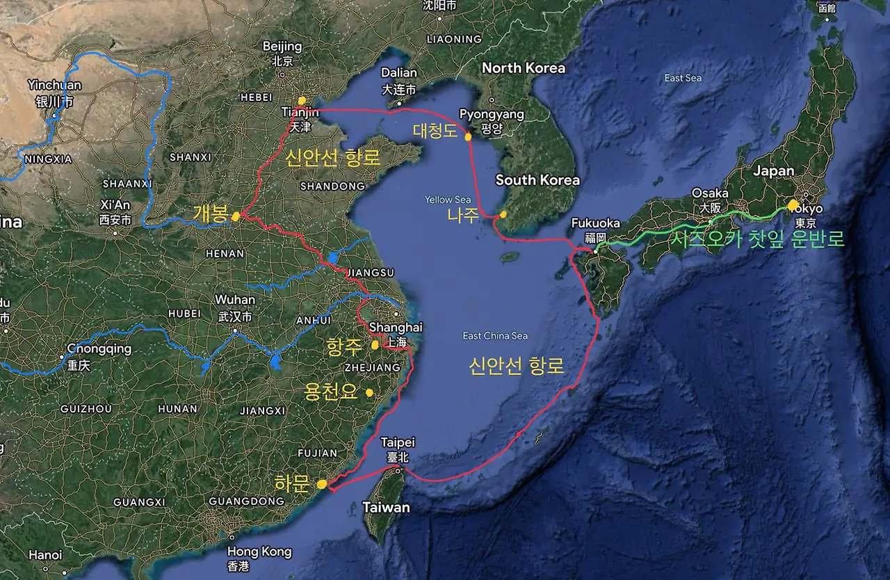 화약을 내려놓고 신선한 차(茶)만을 수많은 자기(瓷器)에 잔뜩 실은 신안선은 천진(天津)을 통해 중국 내륙으로 들어가 차(茶)들을 하역하면서 경항(京杭) 대운하(大運河)를 따라 항주(杭州) 앞바다로 나온 후 다시 소흥(紹興)의 조아강(曹娥江 Caoe jiang)으로 들어가 절동운하(浙東運河)를 통해 명주(영파)까지 내려갔다. 명주(영파)에서 주산군도(舟山群島) 앞바다로 나와 라두(螺頭 Loutou) 채널(channel)과 불도(佛渡 Fodu) 채널(channel), 남일(南日 Nanri) 채널을 차례로 통과해 남쪽에 있는 하문(廈門)으로 향했다. 신안선의 성공적인 항해는 그것을 가능하게 지원(支援)했던 원나라 황제 영종(英宗)을 암살당하게 했고 영종이 암살당하자 신안선(新安船)은 항상 정비(整備) 받던 그 바다에 수장(水葬)되었다. 신안선(新安船)을 처음 만든 사람들은 푸젠성(福建省)의 차상인(茶商人 Merchant)들이었고 그 신안선(新安船)을 수리(修理)했던 사람들은 고려 나주(羅州) 사람들이었다. 신안선을 기억하고 있다가 정지(鄭地) 장군이 함포(艦砲)를 싣고 대마도까지 항해해 왜구 토벌을 할 수 있도록 귀선(龜船)을 복원(復元)해 낸 사람들은 다름 아닌 나주(羅州)의 조선(造船) 기술자들이었다. 충장공(忠壯公) 김덕령(金德齡)은 조선 왕실이 파묻은 정지(鄭地) 장군을 역사 위로 올린 죄로 선조(宣祖)에 의해 장살(杖殺)되었다. 수많은 사람들이 모인 의병(義兵) 출정식에 정지 장군이 생전에 입었던 갑옷까지 입고 나타나 연설까지 했었다. 김덕령은 귀선(龜船)이 누구에 의해 무엇 때문에 사라진 줄 모르고 한 일이었다.