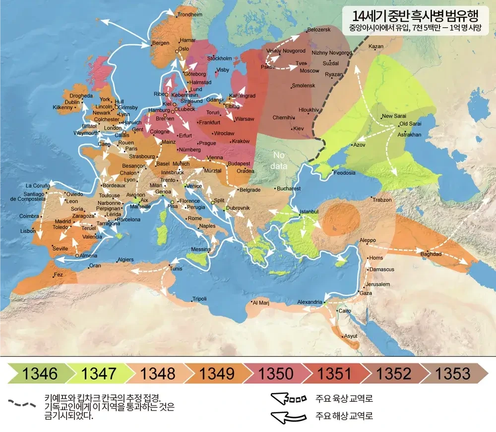 연료(燃料)인 탄소(C) 덩어리 숯이 낮은 온도에서도 발화하는 황(sulphur)의 점화로 함께 연소(燃燒:combustion)되면서 산화제(酸化劑)인 질산칼륨(NO3)이 제공하는 산소들(O3)과 반응하면서 고온 고압이 되어 팽창할 대로 팽창된 이산화황은 그 팽창력으로 막아놓은 모든 걸 총구 밖으로 멀리 쏜살같이 밀어냈다. 폭발력이라 불린 그 기체는 수천 년 동안 난공불락으로 여겨지던 모든 성벽들을 무너뜨리게 될 거대한 돌덩어리들을 쏘아댔다. 화약으로 무언가를 발사하는 것을 대포(大砲)라 부르게 된 연유였다. 그러나 총구(銃口) 밖으로 대포알과 함께 나온 기체는 사람들을 병들게 했다. 이산화황(Sulfur dioxide)은 무색의 자극적인 냄새가 나는 독성이 강한 가스로 사람의 호흡기에 폐렴이나 기관지염 등을 유발하는데 특히 인체의 점막과 작용해 황산을 형성, 염증을 일으켜 세균의 2차 감염을 일으켰다. 지금 프랑스 칼레시 남쪽 크레시에서 언덕 위에 진을 친 영국군에 맞서 언덕 밑에서 바람을 맞으며 전투를 한 프랑스 군 6만 명 중에서 사상자가 3만 명이 나온 연유였다. 특히 두꺼운 갑옷으로 머리부터 발끝까지 빈틈없이 무장(武裝)한 귀족 기사들은 호흡 곤란으로 쓰러졌고 영국군 농부 보병대는 쓰러진 기사들의 갑옷 틈새로 단검을 찔러 그들을 죽였다. 이 전투 하나에서 전체 프랑스 귀족의 삼분의 일이 희생되었다. 크레시(Crecy) 전투에서 영국군 사상자 수는 150- 250명이었다. 그들의 시체를 들락거렸던 쥐들로 흑사병은 창궐로 나아갔다. 화약무기인 화포(火砲)는 신무기였고 따라서 화약은 초고가였다. 에드워드 3세는 이탈리아의 금융업자인 바르디(Bardi)가(家)와 페루치(Peruzzi)가(家)로부터 돈을 빌려 이 화포를 운용했고 결국 디폴트(채무불이행)를 통해 두 집안을 파산시켰다. 흑해로부터 이탈리아를 거쳐 들어온 이 화약은 결국 그 교역로를 따라 흑사병을 퍼뜨렸다. 유럽 모직물 산업의 중심이었던 플랑드르(플랜더스)를 차지하려는 영국과 프랑스의 탐욕은 결국 유럽 인구의 삼분의 일에 이르는 사람들이 3년 안에 죽는 전대미문의 대참사를 불러왔다.