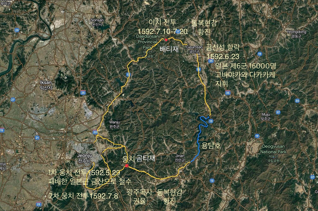 고려의 제일검이었던 척준경 장군처럼 조선의 제일검이었던 지금의 전남 화순(和順) 지역인 동복(同福) 현감 황진 장군이 대포와 총이 주도하던 임진왜란에 검(劍)으로 그 이름을 당당히 전사(戰史)에 남길 수 있었던 것은 바로 그 일본군의 화약 부족 때문이었다. 침략한 날로부터 60일이 지나면서부터 전역(戰域) 곳곳에서 일본군이 조선의 의병 부대들에게 패배한 연유였다. 모리 모토나리(毛利 元就)의 셋째 아들 고바야카와 다카카게(小早川隆景)가 이끄는 만오천 명으로 구성된 6군이 화약을 확보하기 위한 전주성 공격에 금산성에서 진군시킨 군대는 고작 이천 명이었다. 역시 화약이 부족해서였다. 화약 확보를 위해 1592년 7월 8일(8.14) 같은 날 이루어진 일본군의 호남을 향한 땅과 바다에서의 전투(이치전투와 한산도 대첩)는 모두 조선의 승리로 끝났다. 팔도 도원수(八道都元帥)로 조선군을 이끌었던 권율 장군이 전라도 광주목사로 참여해 승전으로 이끈 이치전투(梨峙戰鬪)를 임진전쟁의 승패를 결정하는 데 있어 행주대첩보다 더 결정적인 싸움으로 평가했다는 것은 사위인 이항복이 남긴 백사집(白沙集)의 기록이다.