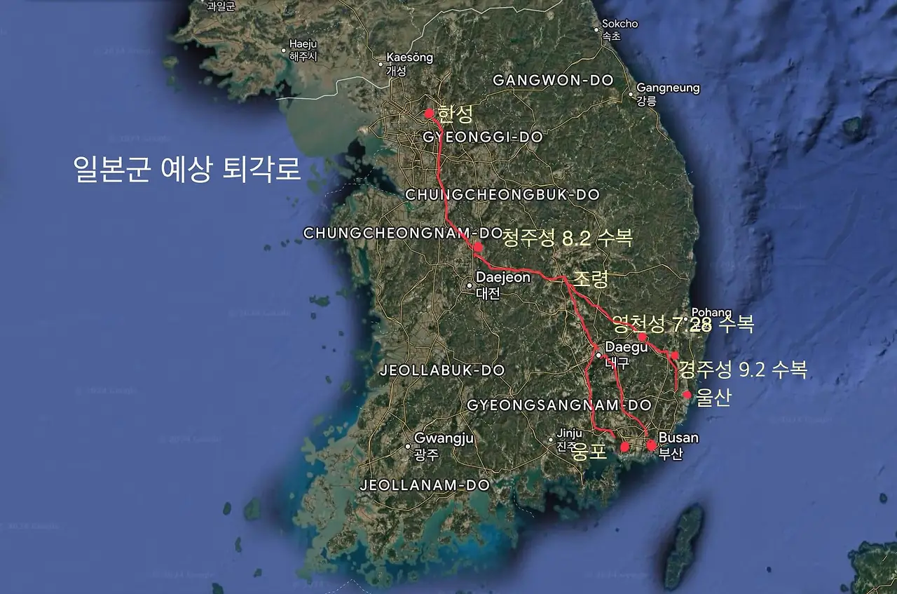 처음부터 잘못 고른 곳에서 잘못 고른 사람들과 치른 절망적 전쟁이었다. 아메리카 대륙과 필리핀에서 그리고 중국과 ㅡ일본에서 이미 충분히 겪어 본 사람들이라 생각했던 펠리페 2세였다. 그러나 그들은 달랐다. 같은데 완전히 다른 조선인들이었다. 한양까지만 함락시키면 틀림없이 강화조약을 맺고 통상이 이루어질 거라 호언장담하며 두둑한 은괴를 챙겨갔던 명나라 대신들이었다. 1592년 4월 13일(5.23) 다대포에 상륙해서 14일 부산진성 15일 동래성 25일(6.3) 상주성 27일(6.6) 조령을 넘어 28일 충주성 5월 2일(6.11) 남대문으로 한양 입성한 1군과 4월 18일(5.28) 부산포에 상륙해서 19일 지금의 언양읍(彦陽邑)인 언주(彦州)를 거쳐 21일(5.31) 경주성 22일(6.1) 영천성 27일 조령 28일(6.7) 충주성 5월 2일(6.11) 동대문으로 한양 입성한 2군, 4월 19일(5.29) 부산포를 거쳐 20일 김해에 상륙해 창원, 거창, 김천을 거쳐 28일(6.7) 추풍령을 넘고 옥천, 청주, 진천, 용인을 거쳐 5월 7일(6.16) 노량진을 통해 한양 입성한 3군의 진격 속도는 유례를 찾아볼 수 없는 놀라운 것이었다.
