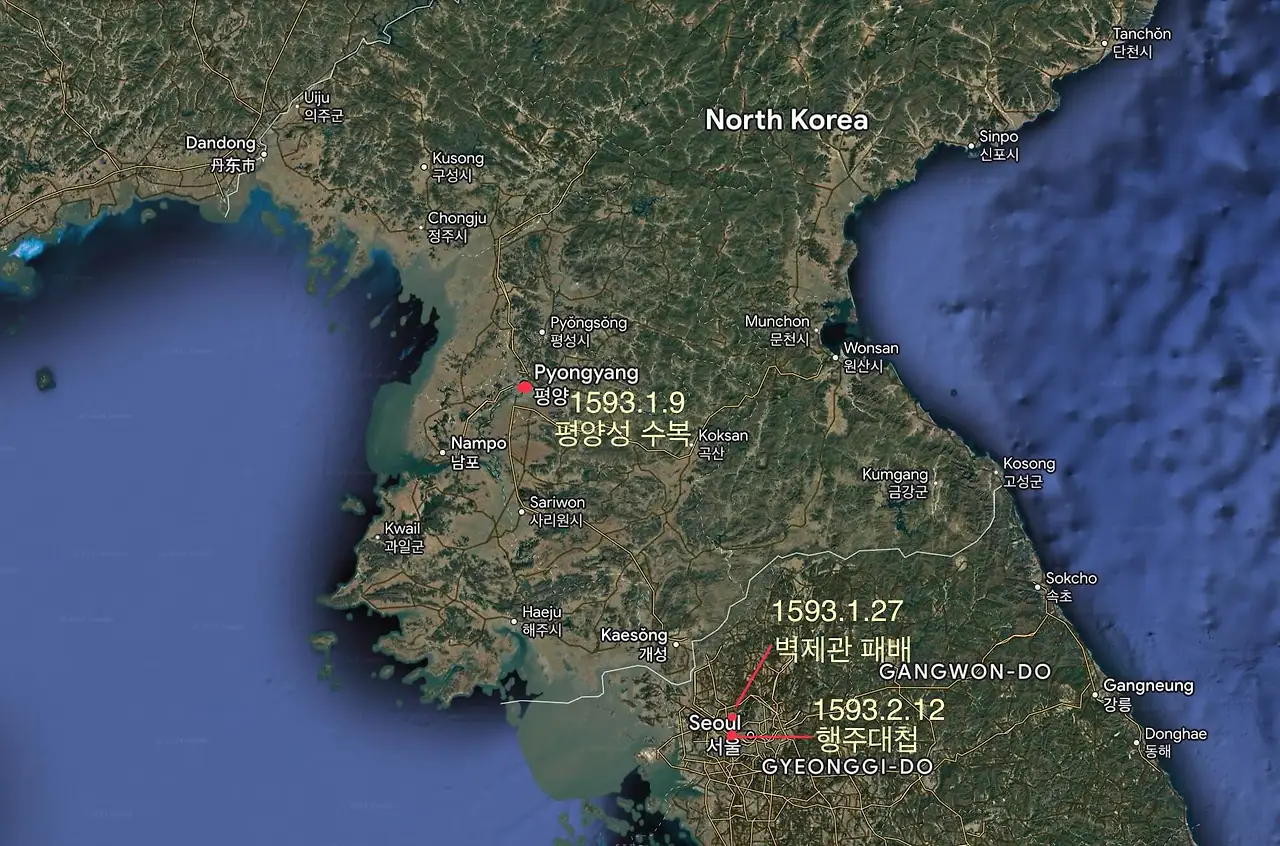 요동 부총병(副摠兵) 조승훈이 삼천명의 기마군만을 이끌고 항왜원조군(抗倭援朝軍)으로 조선에 들어온 건 1592년 6월이었다. 일본군을 얕잡아 보던 그는 8월 23일(9.28) 평양성내에서 일본군의 매복에 걸려 단지 부하 몇십 기만 이끌고 간신히 중국으로 돌아갔다. 명나라 조정은 이후 진사(進士) 출신의 정 3품 병부우시랑(兵部右侍郞) 송응창(宋應昌)을 경략비왜군무(經略備倭軍務)에 임명해 항왜원조군(抗倭援朝軍) 총사령관으로 조선에 파견했다. 경략(經略) 송응창이 제독(提督) 이여송(李如松)이 지휘하는 43,000명 병사들을 휘하(麾下)에 두고 조선에 들어온 건 1592년 12월 25일(1.27)이었다. 방해어왜총병관(防海禦倭摠兵官) 이여송이 부총병 양원(楊元)이 지휘하는 불랑기포로 무장한 포병대의 활약으로 1593년 1월 9일(2.9) 평양성을 탈환한 후 이동하는데 상대적으로 많은 시간이 소요되는 포병대 없이 자신의 기마군만으로 후퇴하는 일본군을 급하게 추격하다 벽제관(碧蹄館)에서 간신히 살아 나오는 충격적인 패전이 일어났다. 1593년 1월 27일(2.27) 벽제관에서 부하들의 죽음으로 겨우 연 퇴로(退路)로 살아온 이여송은 개성을 넘어 평양까지 되돌아갔다. 벽제관 碧蹄館) 전투는 임진전쟁 중 화약무기의 사용이 거의 없었던 유일한 재래식 전투였다. 일본군에게는 화약이 더 이상 없었다. 한양 탈환 작전에 참여하기 위해 명나라군을 기다리며 행주에 진을 친 2,800명의 조선군이 만난 건 명군(明軍)을 격퇴해 기세가 오른 3만 명의 일본군이었다. 1593년 2월 12일(3.14) 벌어진 전투에서 승자총통으로 무장한 화차와 석탄(石彈)들을 날리는 천자총통, 비격진천뢰를 쏘는 완구(碗口)등의 화약 무기로 3만의 일본군을 권율이 이끄는 조선군이 무찌른 연후에야 가까스로 다시 개성까지 남하한 명나라군이었다. 일본군에게는 이제 강화회담만이 살 길이었다. 모를 리 없는 송응창이었다.