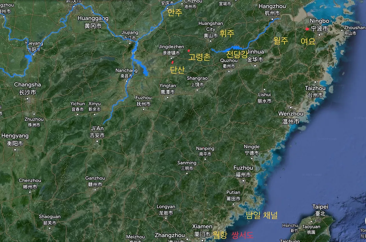 경덕진(景德鎭)의 남쪽으로 십오 리 떨어진 단산(團山)에서 토청(土靑)이라 불린 휘코발트 Cobaltite(CoAsS) 광산이 왕직과 그의 동향인 황산(黃山) 사람들에 의해 발견되었다. 산소를 공급하면서 원광석을 계속 가열하면 비소(As)와 황(S)이 가스로 제거되는 원리를 이용해 산화코발트(Co2O3)를 얻는 공정이 확립되었다. 화감청(花紺靑)이라 불린 산화코발트를 안료(顔料)로 사용하여 고령토로 빚은 백자에 그림을 그린 후 장석 유약통에 담갔다 꺼낸 후 1,350도의 고온으로 환원염 가마에서 구워내면 장석유약이 만들어내는 피막 외에 별도의 피막이 또 덮혀진 백자를 만들어 낼 수 있었다. 국산화된 화청(花靑)은 비용 걱정 없이 양껏 사용되었고 고령토 흙 안에 있던 알루미늄 성분이 안료로 묻힌 산화코발트와 결합하여 별도의 피막을 만들어내며 이중으로 장석유약을 시유한 효과를 내고 있었다. 습기뿐 아니라 염기(鹽氣) 까지도 막아내는 새로운 자기가 만들어졌다. 청화백자였다. 청화백자에 담긴 화약은 부르는 게 값이었다. 지금 다시 황산시(黃山市)로 부르는 그곳을 그때 휘주(徽州)라 한 연유였다. 안칭(安慶)과 함께 안휘성이 생겨난 연유였다. 1571년 펠리페 2세가 필리핀의 루손섬을 점령해 마닐라에 요새를 건설하고 중국과 본격적인 무역을 강력하개 추진한 연유였다.