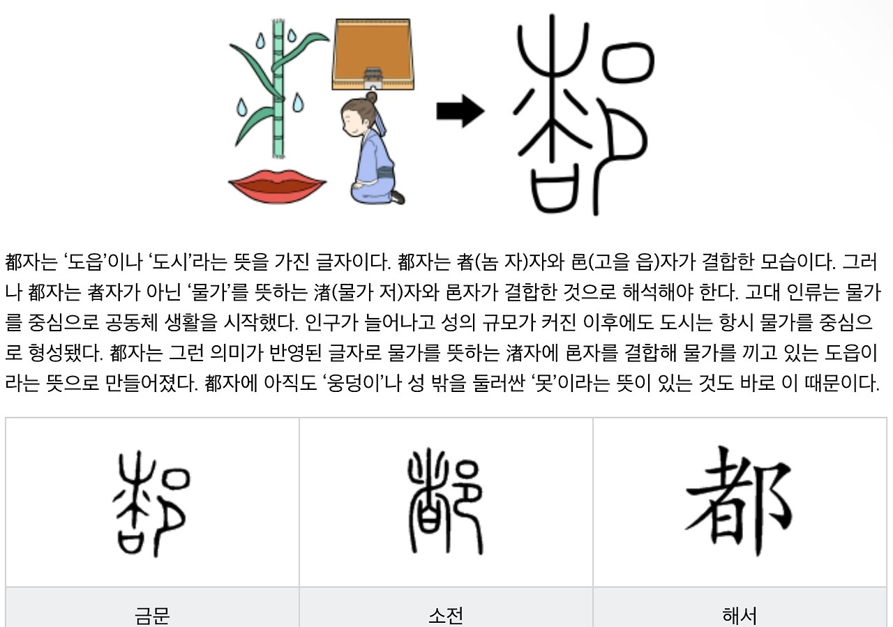 도시(都市)와 도읍(都邑)은 찻잎들을 절구로 압착해 찻잎의 액즙(液汁)을 내고 그 액즙들을 수조(水槽)에 담긴 물에 풀어 대량의 희석(稀釋)된 찻물을 만든 후 그 찻물을 수도(水道) 체계로 사람들에게 공급하는 것이 가능했던 지역을 특정 지어 나타낸 말이었다. 도시(都市)와 도읍(都邑)을 나타낼 때 공통으로 들어가는 도(都) 자에 모이다, 쌓다, 저축하다, 연못(池), 웅덩이 같은 뜻이 있는 이유였다. 도(都) 자는 찻잎의 액즙을 내는 시설들이 언덕(⻏= 阜)에 설치되어 있는 것을 나타낸 글자다.