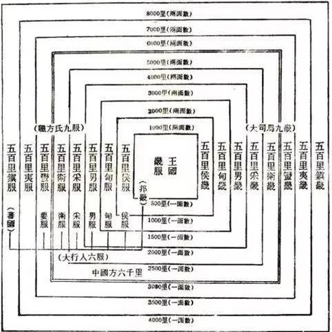 辨九服之邦國, 方千里曰王畿, 其外方五百里侯服, 又其外方五百里曰甸服, 又其外方五百里曰男服, 又其外方五百里曰采服, 又其外方五百里曰衛服, 又其外方五百里曰蠻服, 又其外方五百里曰夷服, 又其外方五百里曰鎭服, 又其外方五百里曰藩服. 구복의 방국이란 왕도(王都)의 1,000리(里) 외방을 왕기(王畿)라 하고, 그 주위를 500리씩 구획하여 후복(侯服), 전복(甸服·경기), 남복(男服), 채복(采服), 위복(衛服), 만복(蠻服), 이복(夷服) 진복(鎭服), 번복(藩服)이라 하여 설치한 것을 말한다. - 주례(周禮) 하관(夏官) 직방씨(職方氏)