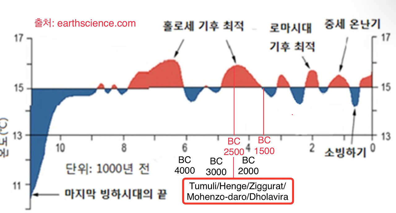 이집트의 피라미드와 메소포타미아의 지구라트 그리고 인더스의 모헨조-다로와 유럽의 헨지가 건설된 것은 모두 기원전 4100년부터 기원전 2700년까지 인류를 괴롭힌 소빙하기 때문이었다. 소빙하기 시대에 희소해져만 가는 찻잎들에게서 최대한 찻물을 확보해 고향을 떠나지 않고 살아남으려고 만들어진 것들이 지구라트와 스투파와 헨지였다. Eartnscience.com에서 만년 동안의 지구 기후변화 역사를 그래프로 묘사한 것을 보면 분명히 확인할 수 있는 사실이다. 신라 박제상이 쓴 증심록(澄心錄) 부도지(符都誌)에 묘사된, 오미의 사변(五味之變 )으로 실낙원(失樂園) 해야 했던 배달(倍達)도 추워진 기후 변화 때문이란 걸 이 그래프는 잘 보여주고 있었다. 추워진 기후변화로 차나무들이 점차 사라져 가자 오랫동안 정들었던 땅을 떠나 또다시 차나무를 찾아 유랑의 길에 나서야 하는 것을 죽기보다 싫어한 사람들이 부족해지는 찻물을 확보해 살던 땅에서 계속 살아가기 위해 서로의 힘을 합쳐 벌인 필사적 노력의 결과가 피라미드와 지구라트, 그리고 모헨조-다로였고 도라비라(Dholavira)와 헨지(Henge)였다.