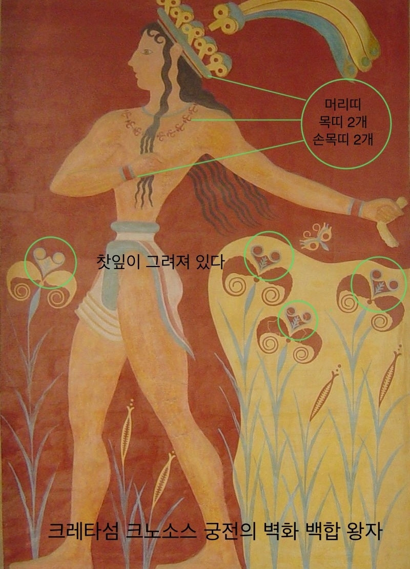 신라의 토우(土偶)와 그 문화의 궤를 같이 하는 토기 인형들이 발굴되어 관심을 끈 모헨조-다로의 남동쪽, 인더스와 가가하크라 강 사이에 있는 차누다로(Chanhudaro)에서는 차(茶)를 차[cha]라고 발음했다. 스키타이인들은 차를 샤[sha]라고 불렀고 바빌로니아 제국을 세운 칼데아인(Chaldean)들은 차(茶)를 카[ka]라고 불렀다. 거대한 화산 폭발 전까지 에게해 차(茶) 교역의 중심지였던 테라섬(island of Thera (Santorini)에서는 차를 테[the]라고 불렀다. 이 모든 지역에서 차나무는 생명의 나무였고 그 나무에서만 얻을 수 있는 찻잎은 그래서 신분과 계급을 나타내는 결정적 증거였다. 그런 찻잎을 덩굴로 연결해 어깨와 허리춤에 옷처럼 착용한다는 것은 그것을 지니고 있는 사람은 자신은 물론 주변의 사람들에게도 찻잎을 제공할 수 있다는 것을 의미했고 이는 그대로 다른 사람들의 존경과 복종을 가져왔다. 찻잎을 꽂을 수 있는 띠를 두르는 것도 엄격한 구별이 있었다. 크노소스(Knossos) 궁전의 백합 왕자(prince of lilies)라는 제목의 벽화를 보면 왕자는 머리띠와 두 개의 목띠, 손목띠 그리고 허리띠를 하고 있다. 같은 궁전에 그려진 미노안 여인들(Three minoan Women )을 보면 머리띠와 목띠, 손목띠를 하고 있다. 그러나 다른 벽화에 그려진 항아리들을 들고 있는 남녀들은 팔뚝띠나 손목띠만 하고 있고 많은 찻잎을 안정적으로 꽂아 휴대할 수 있는 목 띠나 머리띠는 없다. 솔거가 꿈에 본 단군을 그렸다는 단군 영정에는 나뭇잎을 어깨와 허리에 촘촘히 두르고 있는 단군이 있었다. 백합왕자 벽화와 단군 영정에 그려진 건 백합도 나뭇잎도 아닌 찻잎이었다.