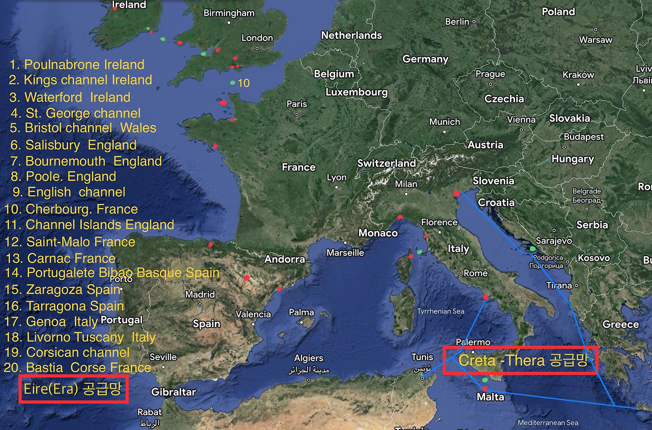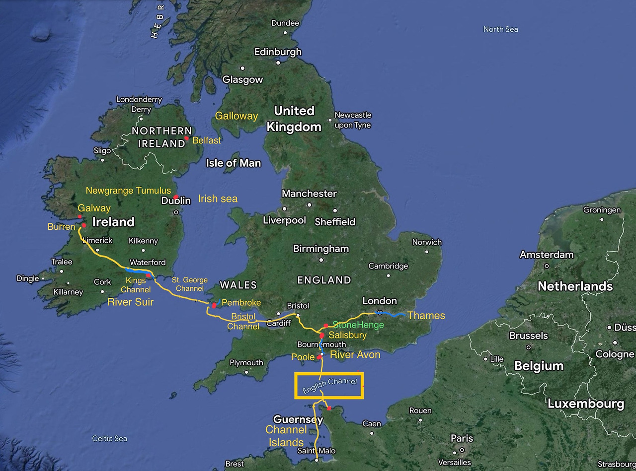 찻잎이 주로 수로(水路)를 통해 교역되었기에 차널은 주로 뱃길에 그 이름이 붙여졌다. 채널(channel)이었다. 아일랜드 풀나브론(Poulnabrone) 고인돌(Dolmen)이 있는 클레어(Clare) 뷰렌(Burren)에서 시작된 찻잎 교역로는 아일랜드의 Ennis와 Limelick, Clonmel까지 육로로 연결되었다가 Clonmel에서부터 Waterford항의 킹스 채널(Kings channel) 까지는 Suir 강(江)을 통해 이어졌다. 워터포드(Waterford) 하버(harbour)를 출발해 세인트 조지 (St. George) 채널(channel)을 통해 아이리쉬(Irish) 해를 건넌 차(茶) 무역선은 영국 웨일스(wales)의 클레다우 두(Cleddau Ddu) 강으로 들어가 펨브로크(Pembroke) 하버(harbour)에 정박했다. 다시 브리스톨(Bristol) 채널을 거쳐 영국 브리스톨 하버(harbour)에 도착했다. 브리스톨 하버에서 찻잎들은 배에서 내려져 수레에 옮겨 실어졌고 이후 육로로 Bath와 Warminster를 거쳐 스톤헨지가 있는 솔즈베리(Salisbury)에 도착했고 이후 Salisbury에서는 다시 배에 실려 아본강(Avon river) 수로(水路)로 프랑스에 찻잎들을 보낼 Poole 하버(harbour)에 도착했다.