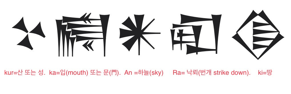 지구라트인 바벨탑이 있던 바빌론(Babylon)은 아카드(Akkad)인이 남긴 수메르어로 하늘의 신(神)이 벼락을 내려친 땅으로 들어가는 입구에 세워진 성이란 뜻이었다. 바빌론(Babylonia)을 세운 아카드인(Akkadian)들이 남긴 설형(楔形) 문자는 위의 사진과 같은데 이때 쿠르(kur)는 산이란 뜻이고 카(ka)는 입(mouth) 또는 문(門)이라는 뜻이며 안(an)은 하늘, 라(ra)는 낙뢰(落雷:strike down)라는 뜻이고 기(ki)는 땅이란 뜻이다. 결국 하늘 신이 벼락을 떨어뜨린 땅으로 들어가는 산문(山門) 또는 성문(城門)이란 뜻이다. 이슈타르의 문으로 알려진 바빌론 성곽의 성문(城門)이 바빌로니아를 건설한 네부카드네자르 2세에 의해 그토록 화려하고 장엄하게 건축된 연유였다. 경주의 불국사와 양산의 통도사, 승주의 송광사와 구례의 화엄사, 영주의 부석사와 보은의 법주사등 우리나라의 오래된 대찰(大刹)들에는 일주문(一柱門)으로 시작해 금강문(金剛門), 천왕문(天王門), 불이문(不二門)들이 지어져 있고 이들 문(門)들을 차례로 지나야 비로소 법당에 들어설 수 있도록 되어있는데 이런 사찰들은 그래서 산문(山門)이라 불렸다. 구산 산문(九山禪門)은 그 대표라 할 수 있다. 산문(山門)이란 결국 폭풍우 신의 축복인 차(茶) 나무들을 지키고 찻잎을 보관하고 찻물을 제조해 중생들을 살리는 중차대한 일을 수행하던 곳을 말하는 곳이었다.