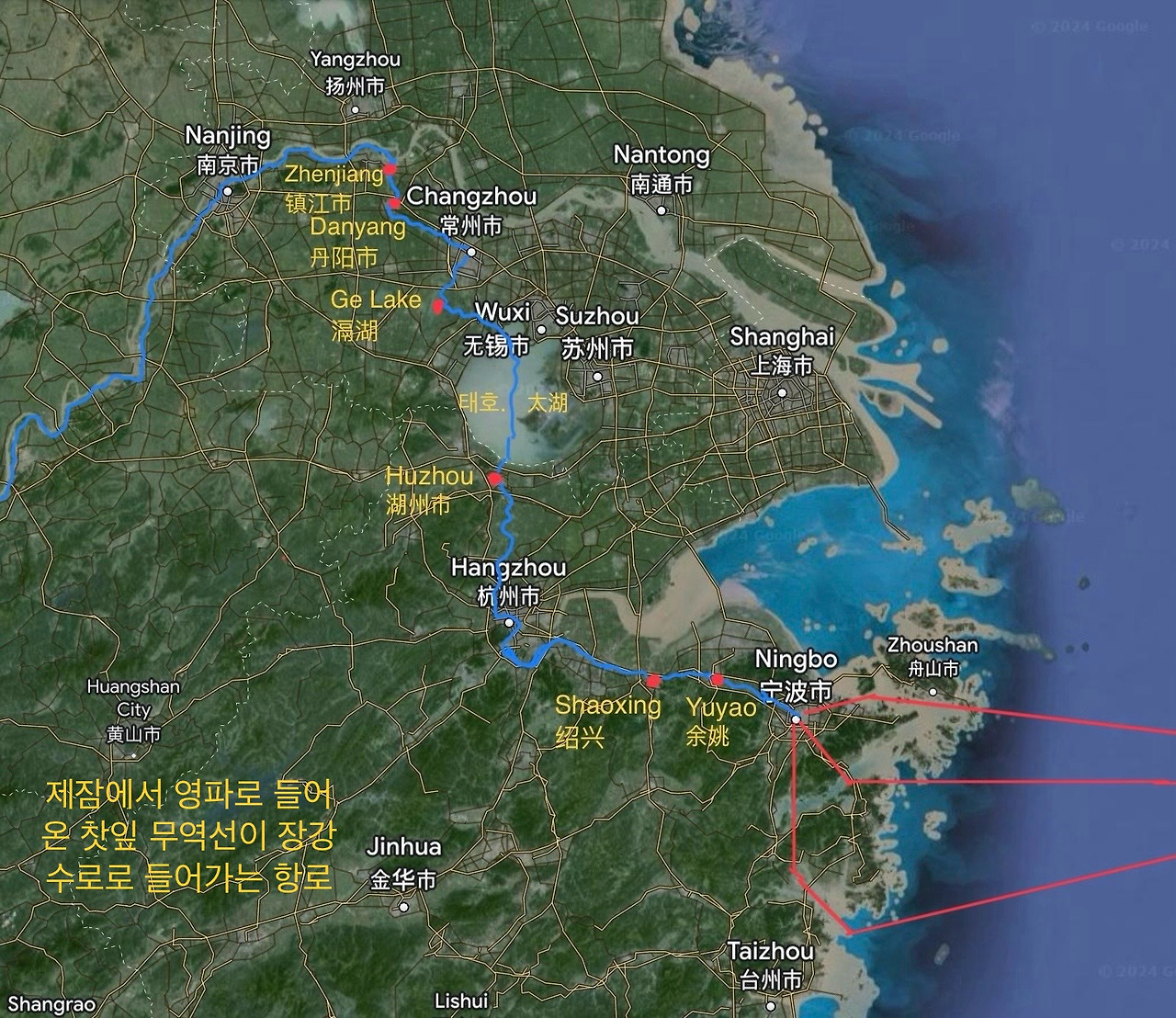 하(夏) 나라 시조인 우(禹)가 말년에 장강 하류 지역과 가까운 전당강 하구인 회계(會稽:지금의 항주 杭州)에서 죽어 그곳에 무덤(大禹陵)이 있는 연유는 장강의 치수 때문이 아니라 부상국인 제잠(蹄岑)에서 생산된 찻잎이 바닷길로 들어오는 곳이 회계(會稽)였기 때문이었다. 지금의 영파(寧波)인 명주(明州) 지역 해안에 수도(水道 :waterway)가 아닌 채널(茶道 :channel)로서 라두(螺頭:Loutou) 채널(channel), 불도(佛渡:Fodu) 채널, 우비산(牛鼻山:Nubi Mt.) 채널이라는 차(茶)가 운반되는 뱃길(水道)이 세 개나 되고 두양항(頭洋港: Touyang Harbour)을 필두로 총 6개의 차(茶)가 하역되는 하버(Harbour: 茶港)가 존재하는 이유는 제잠에서 수입되는 찻잎들을 실은 선박들이 이들 뱃길과 항구를 통해 들어와 영파와 여조(Yuyao 余姚市), 항주와 호주(Huzhou 湖州市), 태호(太湖)와 격호(Ge Lake 滆湖), 상주(Changzhou 常州市)와 단양(Danyang 丹阳市)을 거쳐 진강(Zhenjiang 镇江市)에 이르러 장강 수로로 별도의 하역작업 없이 바로 들어설 수 있게 하려고 했기 때문이었다. 회계(會稽)라는 지명도 인계자와 인수자가 만나(會) 서로가 가지고 있는 지절(持節)을 맞춰보고(稽) 거래가 정확한지 확인하는(稽) 곳이라 해서 붙여진 것이었다.