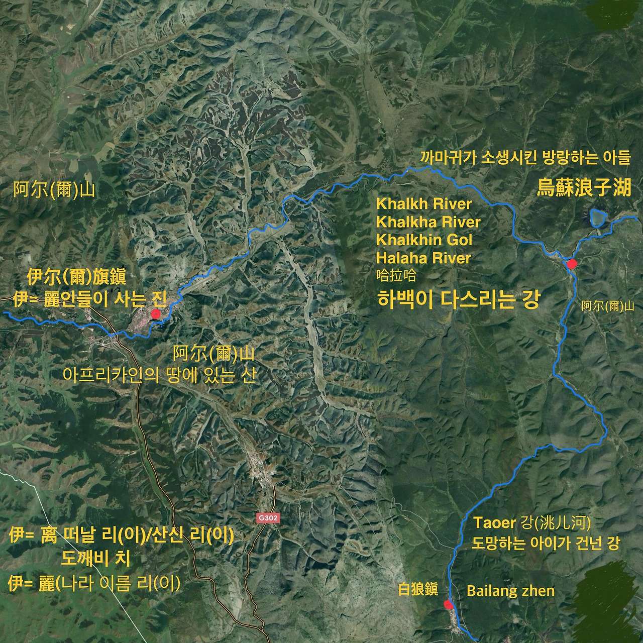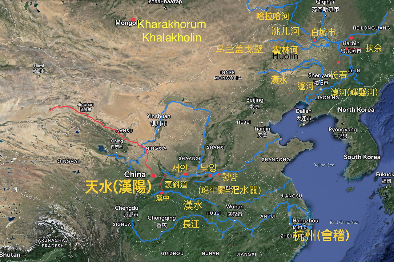 황하 이남 지역의 차(茶) 수송을 총괄하던 한양(漢陽)이라고도 불린 그 지역을 천수(天水)라 한 것은 그 지역이 부이르(Buir) 호수 근처 아사달 조선의 연원인 천지(天池)가 있던 지역과 닮았기 때문이었다. 서안(西安)이 아닌 천수(天水)가 황하 이남의 카룸(Karum:차(茶) 거래소)이 된 것은 회계(會稽:지금의 항주)를 통해 들어오는 제잠(蹄岑)의 찻잎이 장강과 한수(漢水)의 수로(水路)를 이용해 서쪽으로 보내질 수 있어서였다. 산동반도로 들어온 근역(槿域)의 찻잎이 낙양에 모였다 서안을 거쳐 서역으로 수출되었다면 절강성 회계를 통해 들어온 제잠(蹄岑)의 찻잎은 장강과 한수를 거슬러 한중(漢中)까지 들어온 후 한양(지금의 천수)으로 모여져 서역으로 수출되었다. 주(周) 나라 4대 왕인 소왕(昭王)이 뜬금없이 한수(漢水)에 빠져 죽은 이유와 그 아들 목왕(穆王)이 형양(滎陽)에 호뢰관(虎牢關)을 설치한 이유는 바로 이 장강과 한수(漢水)를 이용해 한중(漢中)과 천수(天水)로 이어진 차(茶) 무역로에 대한 일부 통제권을 얻기 위함이었다. 낙양을 통제한 주공(周公)의 예에서 알 수 있듯 주(周) 나라의 끝없는 차(茶) 무역로에 대한 통제권 야욕은 결국 주(周) 유왕(幽王)의 포사도(褒斜道) 건설을 통한 한중(漢中)으로의 침공이라는 무리수를 두게 했고 이 정벌에서 얻은 미인 포사 褒姒)때문에 유왕은 비명횡사했고 이후 춘추전국시대가 시작된 것은 모두가 아는 역사다. 이렇게 중국은 부상국의 찻잎이 대륙 서쪽으로 수송되어 가는 중에 지나가는 곳이어서, 또 도중에 있는 곳이어서 게다가 그토록 집요하게 중심적 역할을 하려고 해서 붙여진 이름이었다. 중국은 당시 찻잎이 생산되는 지역도 아니었고 초원로(Stppe Road)가 얼어붙기 전까지는 찻잎 무역로로도 이용되지 않았던 땅이었다.