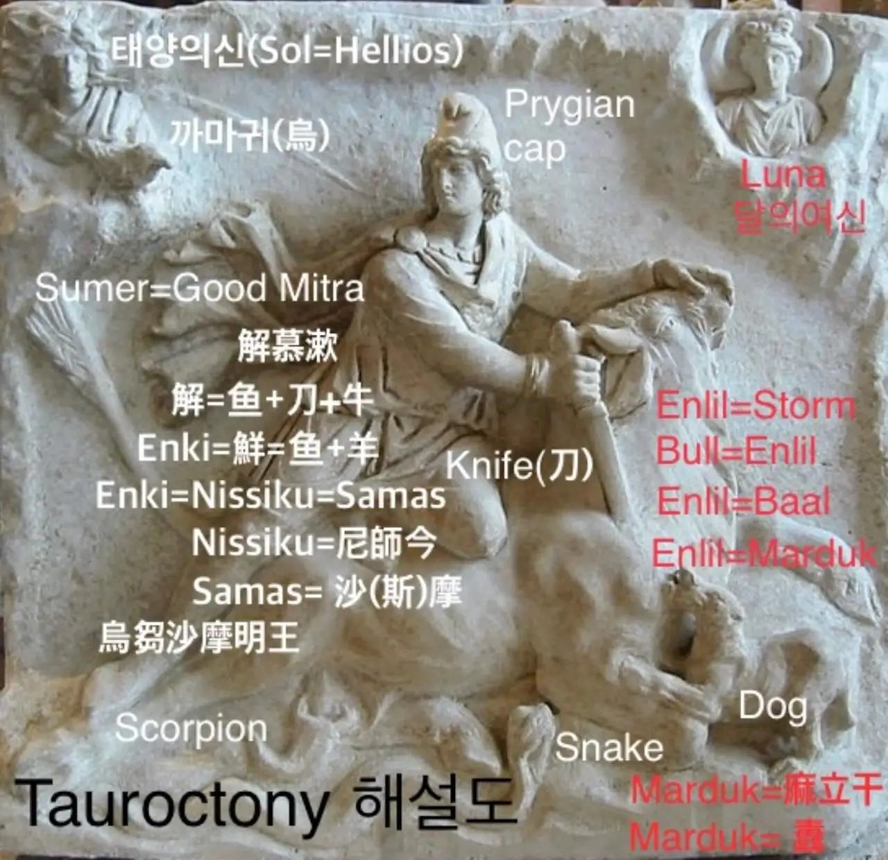 미트라(Mithra) 밀교(mystery religion)의 도상학(圖像學 :Iconography)을 연구한 학자들이 정리한 미트라교의 특징은 세 가지인데 첫째가 미트라가 바위에서 태어나는 아이콘(Icon) 둘째가 프리기아 캡(고깔모자)을 쓰고 아나톨리아식 옷을 입은 미트라가 칼로 황소를 죽이는 아이콘 셋째가 죽은 황소를 두고 미트라가 태양신 솔(Sol:그리스 신화에서는 헬리오스 Hellios)과 만찬을 함께 하는 아이콘이었다. 이 아이콘들이 가리키는 곳은 한 곳이었다. 수메르. 돌멘(dolmen)과 투무리(tumuli), 헨지(henge)와 하투사를 보더라도 바위들로 문명을 이뤄낸 사람들이었다. 바위의 아들이라 할 만했다. 배달족(아카드)들의 최고신은 폭풍우(storm)의 신 환웅, 엔릴(Enlil)이었고 삼위태백에서 원정군(遠征軍)으로 온 사람들은 마르둑(Marduk)이라 부른 엔릴의 아이콘은 황소였다. 미탄니(Mittani)를 건국한 후르리인(Hurrian)들의 최고신도 폭풍우의 신(神)이었고 그 아이콘 역시 황소였다. 황소를 칼로 찔러 죽이는 아이콘(Icon)은 배달족(아카드)들을 죽인다는 뜻이었다. 이 두 번째 아이콘은 그래서 토록토니(Tauroctony)라 해서 별도의 도상학으로 특별히 중하게 다루어졌다. 이 뜻을 글자로 나타낸 것이 해(解) 자였다. 해모수(解慕漱)와 해부루(解夫婁) 그리고 해 씨(解氏)들로 이뤄진 추모왕(皺牟王)을 제외한 고구려 초기의 왕(王)들은 모두 황소를 칼로 죽이는 물고기(鱼= 角)들 즉 수메르(조선족)였다. Tauroctony에서 눈여겨볼 세 번째는 태양의 신이 수메르의 편이라는 것이다. 태양신(헬리오스, 솔)의 품에 안겨 있는 건 까마귀다. 삼족오(三足烏)를 고구려(高句麗)의 상징으로 내세운 건 주몽(朱蒙)이 아니라 해 씨(解氏)들이었다. 고구려 시조 추모(鄒牟)는 해 씨(解氏)가 아니라 고씨(高氏)였고 이름에도 소 우(牛) 자가 들어간 이유는 그가 조선인(수메르)이 아니라 고려인(아카드:배달족)이었기 때문이었다. 고구려 시조 추모왕이 죽어 시신도 없이 아들이라 위조된 유리왕에 의해 장사(葬事) 치러진 연유였다. 밝사상으로 편들어지는 쪽은 배달족이 아니라 수메르다. 원래 달(月)을 품었던 수메르였기에 해(日)까지 품은 수메르는 이제 명(明)이 되었다. 부여와 고구려의 시조가 모두 동명왕(東明王)이 된 연유였다. 철천지 원수인 아카드(Akkad)와 수메르가 고려와 조선으로 함께 하는 나라가 바로 우리나라였다. 우리나라의 고대 역사가 어지러운 맥락으로 어려워진 진 건 그래서였다.