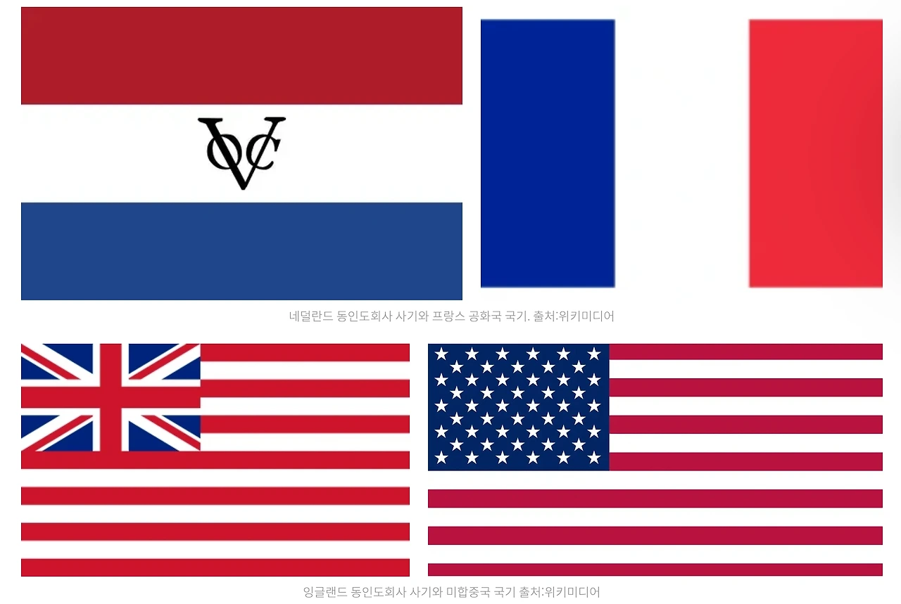 오늘날의 프랑스 공화국 국기(國旗)는 네덜란드 동인도회사의 사기(社旗)를 오른쪽으로 회전하고 가운데 새겨진 동인도회사 로고를 뺀 모양이다. 오늘날의 미국 국기(國旗)는 잉글랜드 동인도회사의 사기(社旗)에서 왼쪽 상단 네모난 부분에 있는 연합 상징 십자가들을 빼내고 별들로 채운 모양이다. 마린로드 상방이 설립한 동인도회사는 없어진 게 아니다. 미국과 프랑스란 공화국(共和國) 국체(國體)로 현재화한 동인도회사는 1597년 2차 조선전쟁에서 성공한 조선도공들의 일본 규슈로의 강제 이주로 시작된 역사다. 임진왜란은…그런 전쟁이었다. 조선은 유사 이래로 단 한순간도 세계사의 변방인 적이 없었던 나라였다. 우리가 살고 있는 세계의 질서는 1597년 정유재란에 의해 잉태된 것이다.