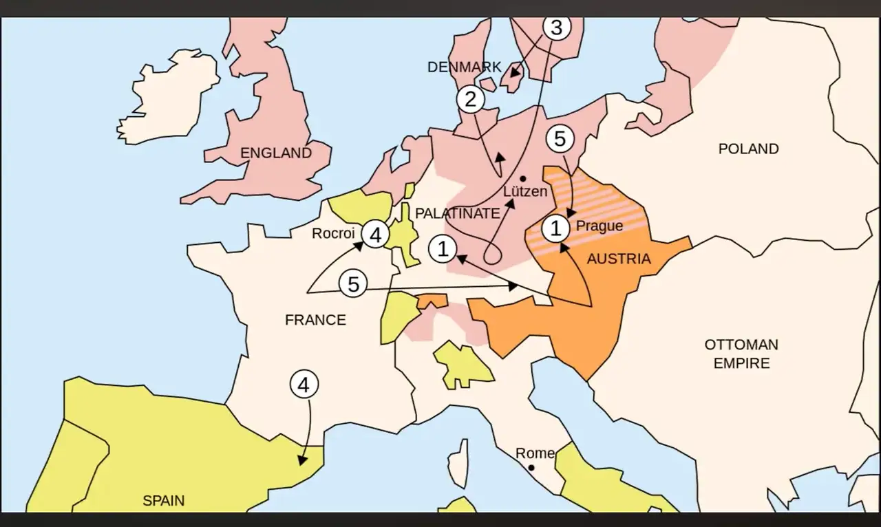 교토에 있는 조선인들의 잘려진 코와 귀의 무덤 비이총. 출처:교토아이넷. 30년 전쟁 진행도. 출처:위키미디어