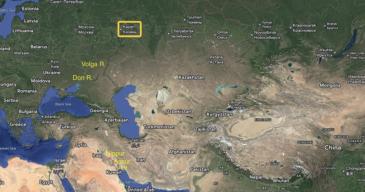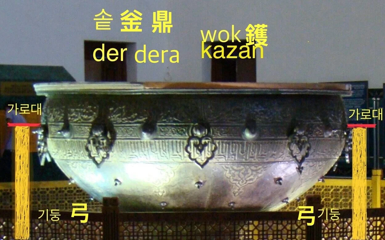 광석에서 구리와 주석, 아연 등을 골라내고 그들을 합금하는 기술인 야금술(冶金術)을 발명했다고 전해지는 신농(神農)이 야금술을 이용해 만든 첫 작품이 바로 물을 펄펄 끓일 수 있는 청동(靑銅)으로 만든 솥이었다. 우리 민족이 솥(釡)이라 부르는 이 용기를 초원(Steppe)의 사람들은 카잔(Kazan:Chazan: 茶盞)이라고 불렀고 메소포타미아 사람들은 데르(der)라고 불렀다. 대륙 서쪽의 차(茶) 나무들이 기후변화로 사라져 가는 관계로 카라반(Caravan: 隊商)들이 우리 민족이 만든 병차(餠茶)와 전차(磚茶) 같은 긴압차(緊壓茶)들을 대륙 서쪽으로 실어 나를 때 동서(東西) 무역로로 각광받았던 초원로((Steppe Road)에서 제일 큰 기착지(寄着地)는 카잔(Kazan)이었다. 메소포타미아와 유럽으로 가는 모든 카라반들이 최종 목적지를 향해 떠나기 전 마지막으로 쉬어가는 도시 카잔(Kazan)은 그래서 카라반들에겐 제대로 된 잠자리에서 잠잘 수 있고 제대로 된 식사를 할 수 있는 숙영지(宿營地: abode, dwell, camp)였다. 산스크리트어로 거주지(居住地: abode, dwell)를 데라(dera)라고 핬는데 이 말은 당시 메소포타니아의 패권국인 아시리아에 데르(der)로 전해졌다. 기원전 2000년경 아시리아(Assyria)를 최강의 제국으로 만든 일루슈마(Ilu-Shuma) 왕은 "나는 아카드 민족과 그 자녀의 자유를 세웠도다. 구리를 정련하였도다. 습지의 경계부터 아수르에서 멀리 떨어진 우르, 니푸르, 아와르, 키스마르, 이스타란 신의 데르까지 그들의 자유를 세웠도다." (The freedom of the Akkadians and their children I established. I purified their copper. I established their freedom from the border of the marshes and Ur and Nippur, Awal, and Kismar, Der of the god Ishtaran, as far as Assur)라고 비문에 새겨 자신의 업적을 기록했다. 우르(Ur)나 니푸르, 아와르, 키스마르, 아수르는 모두 메소포타미아의 도시 이름들이었고 따라서 신의 데르라는 말은 신의 거주지(居住地)란 말이었다. 데르(der)는 거주지란 뜻을 가진 산스크리트 데라(dera)의 변형어였다.