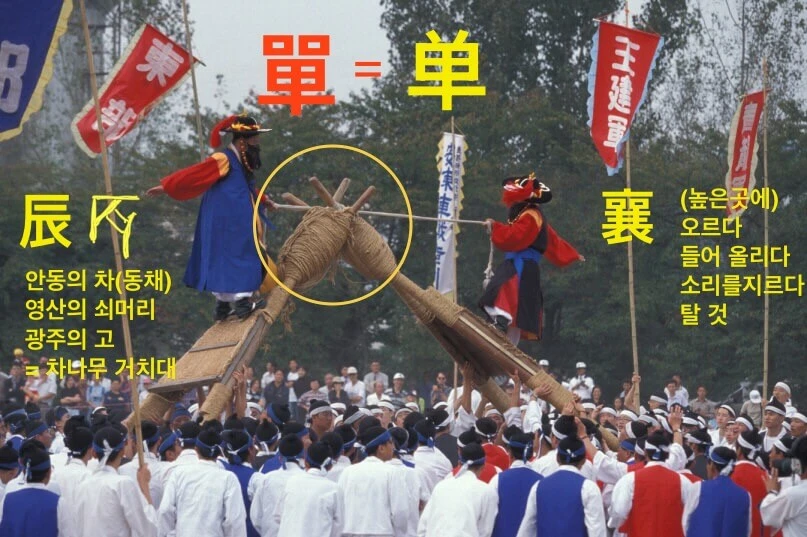 이렇게 불과 물을 담을 용기(容器)가 마련된 조건에서 이제는 불 위에 용기를 거치(据置)시켜 줄 특별한 장치가 있어야 했다. 용기(容器) 안에 넣은 것이 물이 아니면 용기를 불 위에 그대로 두어도 상관없고 조금 기울어져도 크게 문제가 되지 않았다. 그러나 용기(容器) 안의 내용물이 흐르는 액체라면 액체가 용기 밖으로 흘러나오지 않게 용기를 수평으로 유지시켜 주는 장치가 꼭 필요했다. 불이 직접 타오르는 공간인 아궁이를 통째로 감싸는 부뚜막(竈)이 개발되기 전 화재를 방지하기 위해 땅에 구덩이를 파고 그 안에 불쏘시개를 넣고 불을 댕긴 그 위로 물을 넣은 용기(容器)를 수평으로 거치(据置) 하기 위해서는 별도의 궁리가 있어야 했다. 불을 지필 구덩이 양 쪽에 기둥을 박고 그 두 기둥을 연결하는 가로대를 설치하는 방법이 강구되었다. 양쪽에 박은 기둥들은 가로대가 쉽게 벗겨지지 않도록 특별한 모양으로 휘어져 있는 구조로 만들어졌다. 이러한 찻잎 끓이는 모습을 상형한 글자가 죽 죽(粥, 鬻) 자였다. 솥(鬲)을 걸고 있는 가로대가 떨어지지 않고 수평으로 잘 걸려 있도록 오목한 모양으로 만든 양쪽 기둥(弓)에 솥을 걸은 가로대가 거치(据置)된 후 솥에 불이 가열되는 모습을 상형한 글자였다. 솥 정(鼎) 자 또한 양 기둥(ㅜ) 사이로 가로대(爿)가 걸쳐있고 그 가로대에 솥이 걸려 있는 모습을 상형한 글자였다. 차(茶) 나무의 잎들(米)을 끓여 먹으려면 불(火)과 솥(鬲), 그리고 그 솥을 걸고 있는 가로대를 수평으로 유지해 줄 수 있는 기둥들(弓) 즉 거치대(据置臺)가 있어야 했다. 탄핵(彈劾)의 탄(彈) 자에 궁(弓) 자가 들어있는 연유였다. 이집트 신(神)이라면 반드시 쥐고 있는 앙크(ankh)는 솥을 매달고 있는 가로 막대가 벗겨지지 않고 수평을 유지하도록 해주는 거치 기둥(据置柱) 역할을 하는 궁(弓)과 같은 기물이었다. 개와 돼지를 묶어두기 위해 나무에 박을 수도 있는 다용도 기물이었다. 이집트 신이 앙크와 함께 반드시 쥐고 있는 지팡이(Was scepter)는 고유의 기능 외에도 제드(djed)와 함께 앙크의 높낮이를 조절할 때 사용했다. 이제 탄(彈) 자에 왜 선(單) 자가 있는지 논할 차례다.