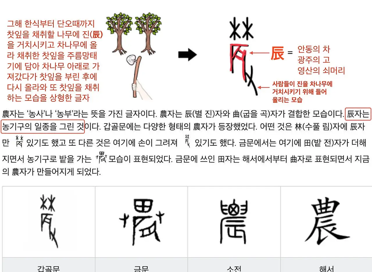 기후한랭화가 진행되던 기원전 3300년경에 활동한 것으로 추정되는 신농(神農)이 아버지라는 존재를 모르고 오로지 어머니만을 알고 사는 당시 인간들에게 처음으로 아버지가 존재하는 가족(家族)의 개념을 만들어 줬다는 이야기가 나온 것은 그래서였다. 추워지는 기후 때문에 사라져 가는 차(茶) 나무는 사람들이 찻잎을 채취(採取)하는 걸 더욱 어렵게 했고 줄어든 찻잎으로 결국 전염병은 점점 더 심해질 거였다. 따라서 더더욱 모여 살면 안 되는 상황에서 솥(鬲)과 거치기둥(弓)을 개발해 얼마 안 되는 찻잎을 가지고 그것을 끓여 먹는 방법을 가르쳐 줌으로써 사람들은 대폭 늘어난 찻잎 공급으로 더욱 모여 살 수 있게 되었다. 찻잎을 그냥 물에 넣어 먹을 때와 끓인 물에 찻잎을 넣어 우려먹을 때를 비교해 보면 같은 양의 찻잎으로 만들어 내는 찻물의 양은 어마어마한 차이가 났다. 찻물이 주는 약효 또한 끓인 물에 우렸을 때가 훨씬 좋았다. 결국 남자들이 여자와 아이들 곁으로 계속 와 머물 수 있었고 더 많은 사람들이 한 마을에서 같이 살 수 있었다. 이렇게 사람들이 모여 살게 되자 남자들은 차(茶) 나무를 찾아 나서게 되었다. 깊은 골짜기로 숨어든 차(茶) 나무를 찾는 것은 쉬운 일이 아니었다. 돼지와 개가 동원되었고 그렇게 찾은 차(茶) 나무에서 찻잎을 채취하는 일이 본격화되었다. 농사가 시작된 거였다. 불과 솥 그리고 거치봉(弓: Ankh)을 거쳐 드디어 신농을 신농이라 부르게 한 최대의 업적인 농사를 가르치는 일이 시작되었다.