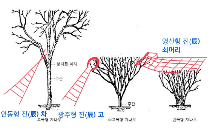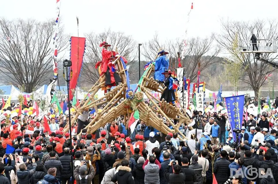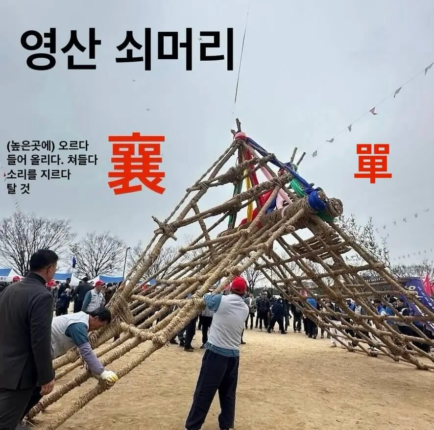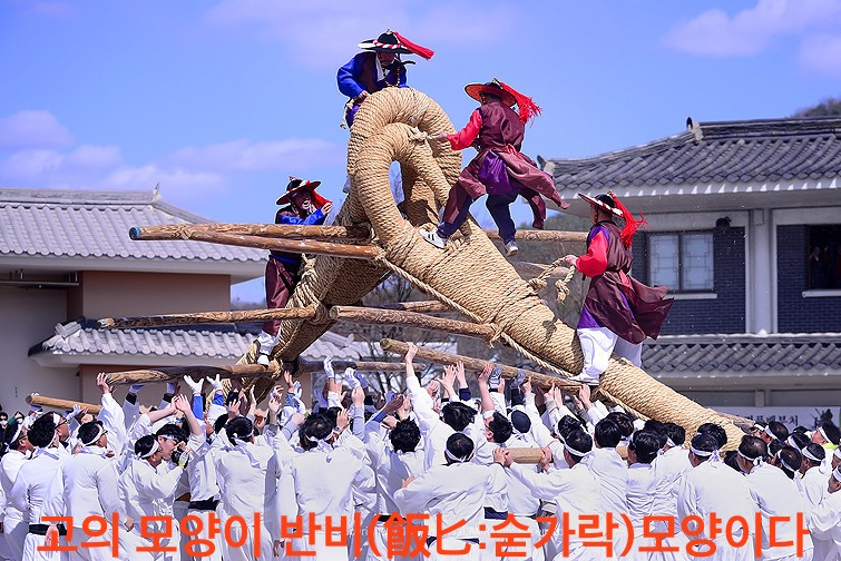 이런 투창과 주살, 외줄 타기 방법이 고안되기 전 차(茶) 나무에 길을 내기 위해선 덤불을 뚫고 가는 방법 말고는 없었다, 옷이 찢기고 머리카락이 엉켜 차(茶) 나무로 다가가기 어렵게 되자 결국 사람들은 옷을 벗고 머리카락을 빡빡 밀고 알몸으로 덤불을 뚫고 나가 차(茶) 나무에 줄을 걸었다. 그 줄은 영산 쇠머리 같은 진(辰)을 설치하게 해주는 생명줄이었다. 덤불에 찢긴 피부는 피범벅이 되어 결국 흉터로 남았고 그 흉한 상처를 안 보이게 하기 위해 그 위에 색칠을 했다. 문신(文身)이 시작된 연유였고 가이사타이같은 알몸 전사가 나타난 연유였다. 우리 민족은 그런 모습으로 나타난 사람들을 도깨비라고 불렀다. 부정(不正)한 고위 공직자를 제척(除斥)하는 것을 탄핵(彈劾)한다고 하는 연유가 여기에 있었다. 홀딱 벗고 피투성이가 되도록 공동체를 위해 희생하는 감투정신을 되새기라는 의미였다. 경남 창녕군 영산(靈山)에서는 찻잎 수송교 역할을 하는 동채(動寨)를 원하는 차(茶) 나무에 거치하는 것을 쇠머리대기라고 불렀는데 안동에서처럼 경쟁하는 마을끼리 대보름날 미리 붙어 승패를 가름함으로써 만일의 불상사를 예방했다. 영산(靈山)의 독특한 동채(動寨)였던 쇠머리는 안동의 동채(動寨)인 차(車)와 그 모양이 달랐다. 안동의 동채인 차(車)가 차(茶) 나무의 몸통(trunk)에 거치하는 것에 치중하는 홑 단(单) 자 모양의 더듬이 구조를 가졌다면 영산(靈山)의 쇠머리는 밭 전(田) 자로 상형(象形)되는 그물망 모양으로 제작된 것이 특징이었다. 안동의 차(車)가 키가 크고 몸통이 굵은 교목(喬木)에 거치할 때 효과적인 반면 영산의 쇠머리는 주변에 덤불들이 빽빽해 차(茶) 나무로 오고 갈 교통로를 만들 수 없는 곳에 위치한 차(茶) 나무에 거치할 때 효과적이었다. 영산(靈山) 역시 안동처럼 차(茶) 산지로 유명했던 고장이었는데 고려말 차무역(茶貿易)을 포기하라는 주원장놈의 살인적 압력에도 굴복하지 않고 사그라들던 공민왕의 국제 차무역(茶貿易) 재건 사업을 다시 일으켜 적극적으로 추동하다 실각했던 신돈의 고향이었다. 그래서인가 영산에서는 행사가 없어진 안동과는 달리 대보름날에서 삼월삼짇날로 날짜만 바꿨을 뿐이지 지금도 창녕군 주최로 영산쇠머리대기놀이를 계속하고 있다. 재정도 빈약하고 주민들도 연로한 악조건 속에서도 조상의 얼을 지켜나간다니 자랑스러운 일이다.
